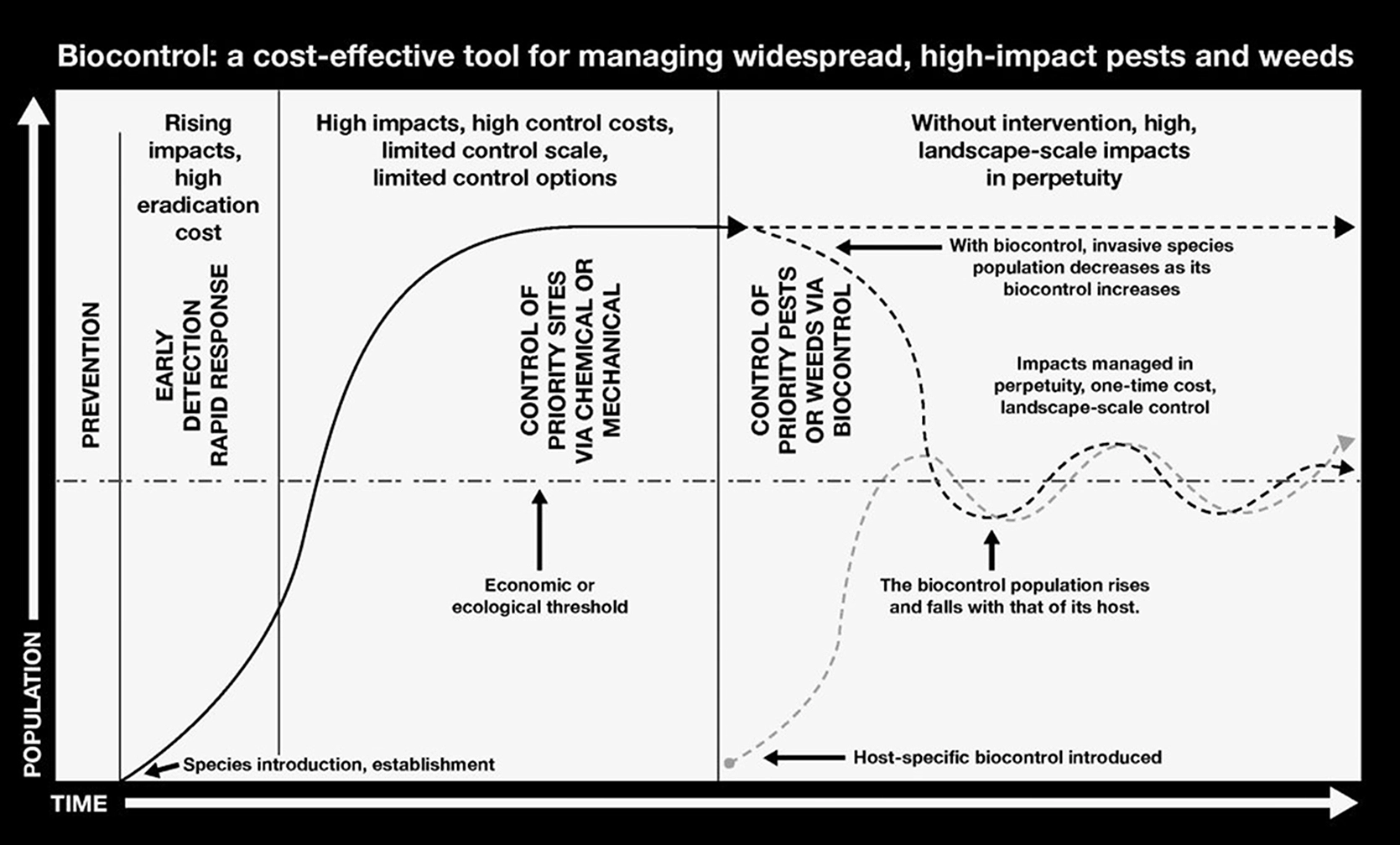 IPM addresses land management beyond weed removal by emphasizing education, prevention, and ongoing monitoring. Land managers assess vegetation to determine whether it meets management goals and identify causes when it does not. As demonstrated by the adjacent invasion curve diagram, prevention is the most cost‑effective strategy for managing invasive species, followed by early detection and rapid eradication. Once invasive weeds are established and spread, eradication becomes unlikely and long‑term control is required. For well‑established infestations, IPM calls for mapping populations, selecting appropriate control methods based on land use, and monitoring results over time. Follow‑up treatments are applied as needed to ensure management objectives are met.