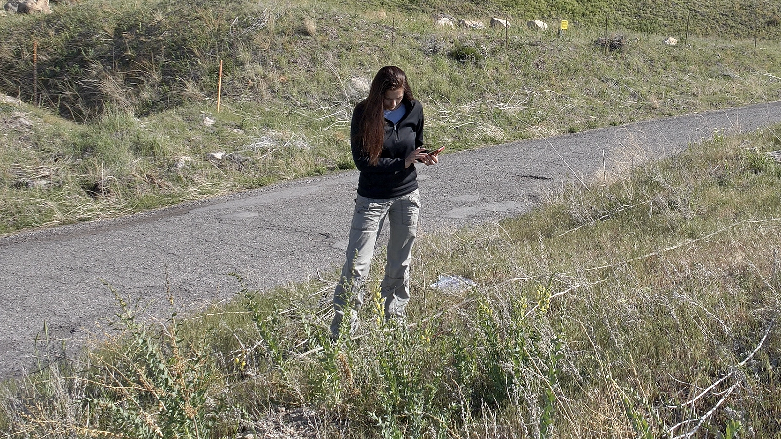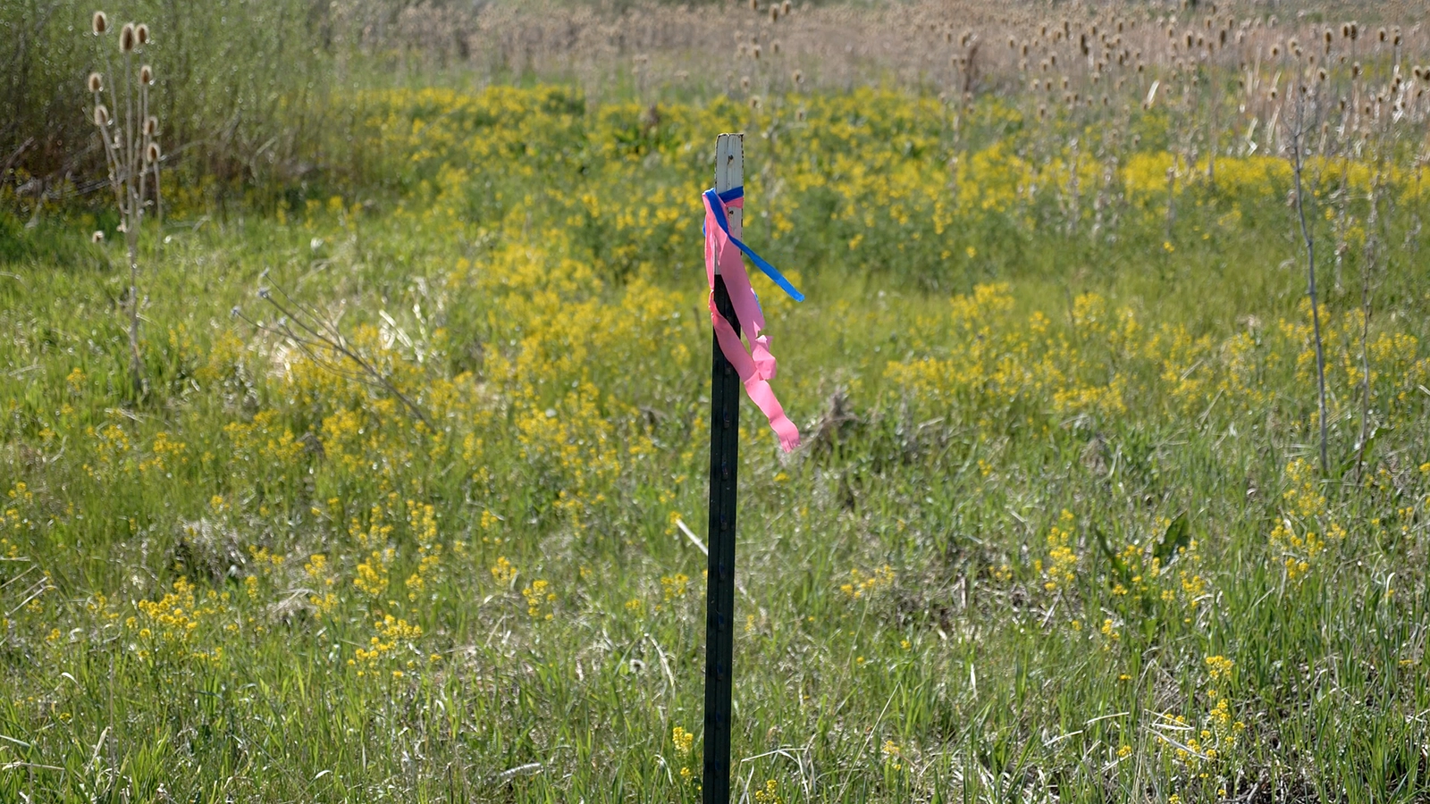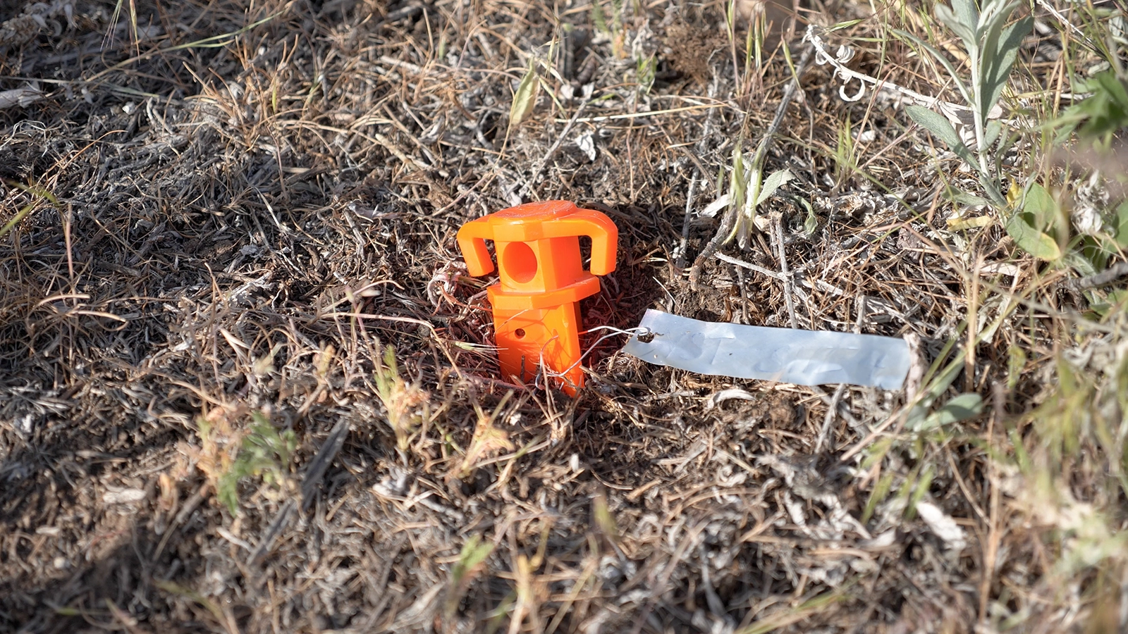 Mark release points with a durable steel post or plastic/fiberglass pole to ensure they can be found later. Avoid wooden posts and pin flags, which deteriorate over time. Use bright, conspicuous colors such as white, orange, pink, or red; avoid yellow and green, which blend into vegetation. Where vandalism is a concern, use short plastic survey stakes or steel plates that can be tagged and later located with a metal detector and GPS. Depending on land ownership or management, a sign may be required to indicate a biocontrol release has been made and to prevent chemical spraying or mechanical disturbance.