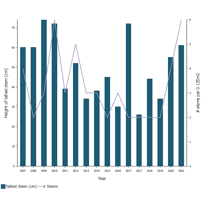 Qualitative monitoring uses subjective observations to describe target weeds and the surrounding plant community. Methods include listing species present, estimating density, age, and distribution, visually mapping infestations, and maintaining photo records. Repeated over time, this approach can show trends in weed populations, but it generally does not support detailed statistical analysis. We therefore recommend the Standardized Impact Monitoring Protocol (SIMP), which combines qualitative observations with quantitative data to identify statistical trends over time.