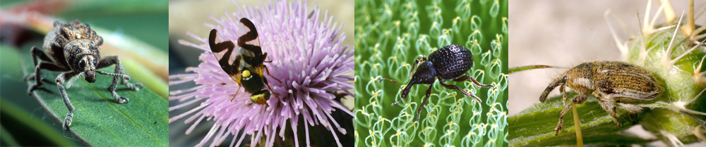 Photos by Stephen Ausmus, USDA ARS (melaleuca leaf weevil, Oxyops vitiosa); Eric Coombs, Oregon Department of Agriculture (Canada thistle stem gall fly, Urophora cardui); Scott Bauer, USDA ARS (salvinia weevil, Cyrtobagous salviniae); Eric Coombs, Oregon Department of Agriculture (yellow starthistle hairy weevil, Eustenopus villosus).