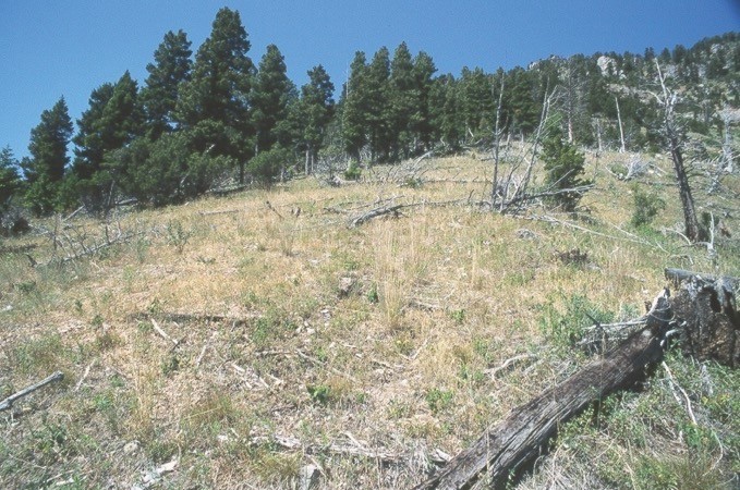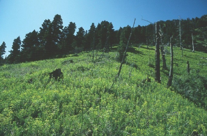 Leafy spurge, Euphorbia virgata, before (left) and after (right) release of Aphthona nigriscutisbeetles in the Bridger Mountains, Montana. USDA ARS TEAM Leafy Spurge.