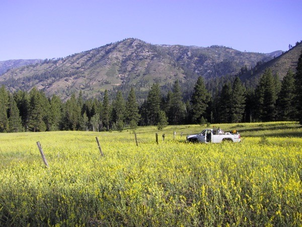 Dalmatian toadflax, Linaria dalmatica, before (2003; left) and after (2010; right) release of Mecinus janthiniformisbeetles in Oster, Idaho. Joseph Milan, USDI BLM.