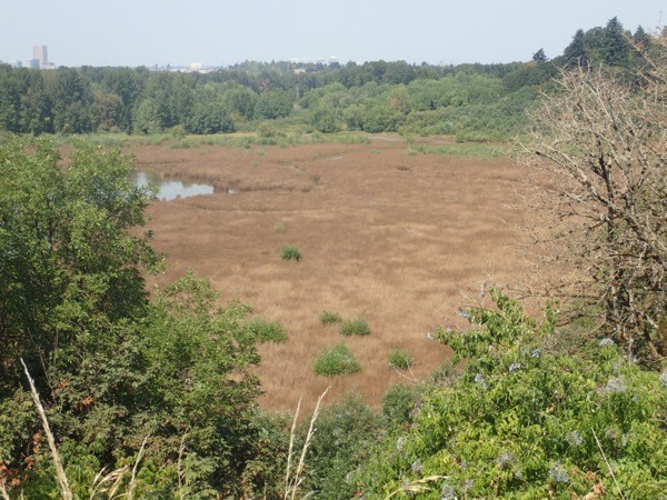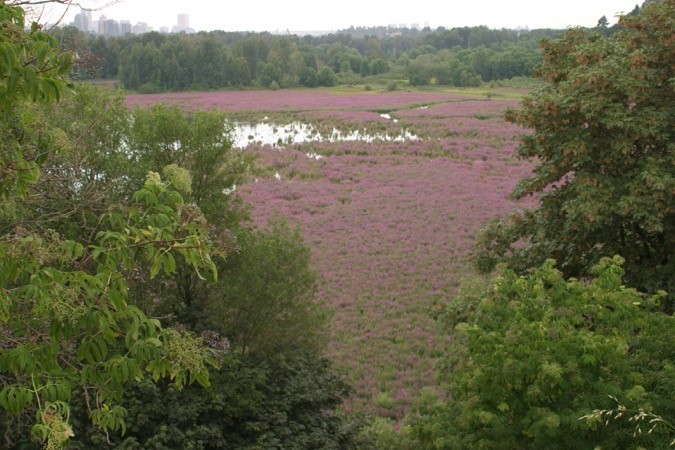 Purple loosestrife, Lythrum salicaria, before (2007; left) and after (2010; right) release of Galerucella spp. beetles in Oregon. Colin Park, USDA APHIS PPQ and Marc Peters, City of Portland.