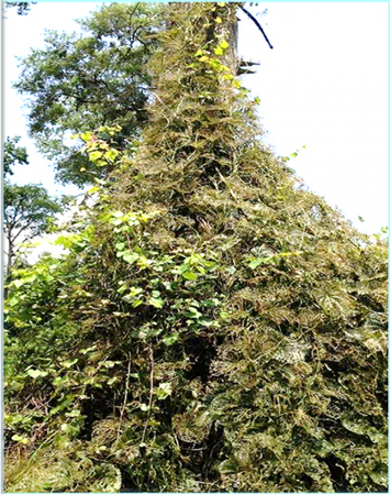 Air potato, Dioscorea bulbifera, before (left) and after (right) release of Lilioceris cheni in South Florida. In the image at right, L. cheni has caused severe defoliation of the D. bulbifera vines engulfing the bottom portion of a large tree; note emergence of new growth of Vitis species following severe defoliation of air potato by beetle larvae and adults. Min B. Rayamajhi, USDA ARS.
