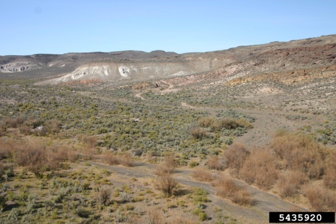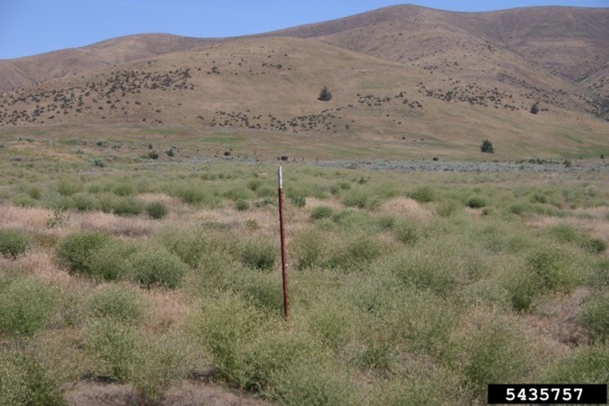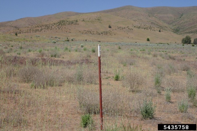 Diffuse knapweed, Centaurea diffusa, before (left) and after (right) release of biocontrol agents (especially Larinus minutus) in Oregon. Eric Coombs, Oregon Department of Agriculture, Bugwood.org.