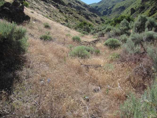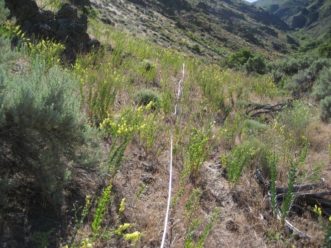 Some biocontrol agent introductions have resulted in spectacular reductions of their target weeds. For example, in the 1990s, Dalmatian toadflax was smothering large tracts of land in western North America and was spreading rapidly. Releases of the beetle Mecinus janthiniformis began controlling the majority of Dalmatian toadflax infestations within two decades, as seen in the images below. This scale of destruction is uncommon for biocontrol, however. In some instances, biocontrol agents have had little to no impact on their target weeds, for a variety of reasons. Most biocontrol programs are considered successful when the target weeds are still present but reduced to the point where the damage they cause is below an acceptable economic or ecological threshold.