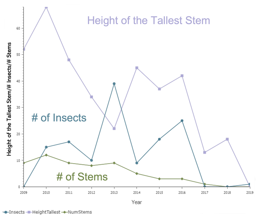 These graphs illustrate the changes and fluctuations in Mecinus janthiniformis populations and the height, number of stems, and cover of Dalmatian toadflax at one site in Idaho since the agent was released in 2009.